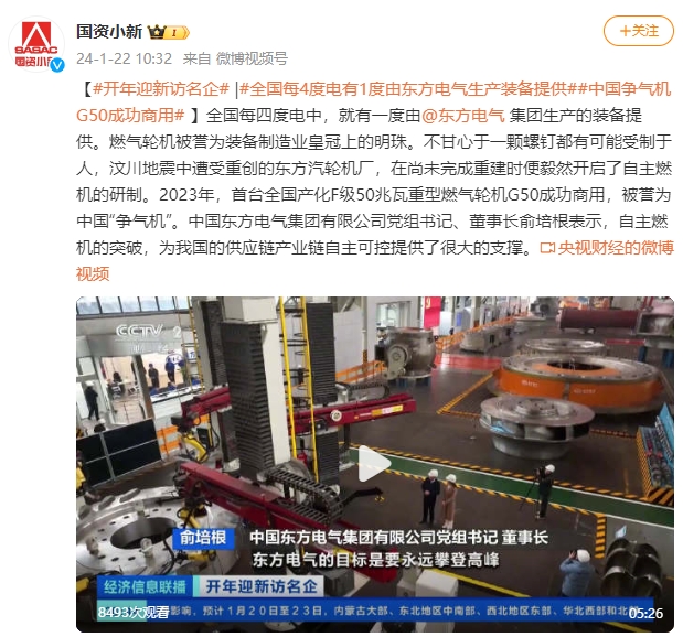 【#开年迎新访名企#|#全国每4度电有1度由东方电气生产装备提供##中国争气机G50成功商用#】全国每四度电中,就有一度由@乐动网生产的装备提供。燃气轮机被誉为装备制造业皇冠上的明珠。不甘心于一颗螺钉都有可能受制于人,汶川地震中遭受重创的东方汽轮机厂,在尚未完成重建时便毅然开启了自主燃机的研制。2023年,首台全国产化F级50兆瓦重型燃气轮机G50成功商用,被誉为中国“争气机”。乐动网党组书记、董事长俞培根表示,自主燃机的突破,为我国的供应链产业链自主可控提供了很大的支撑。