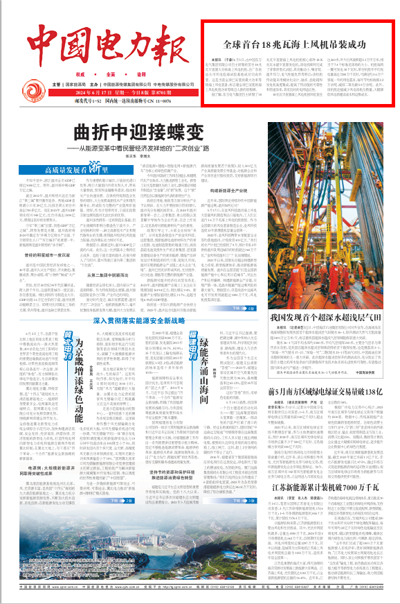 [中国电力报]全球首台18兆瓦海上风机吊装成功
