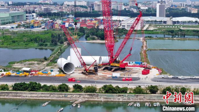 全球单机容量最大海上风电机组正在广东风电临海试验基地进行塔筒吊装。(广东电网公司供图)