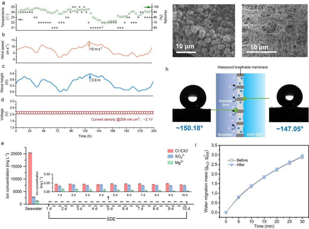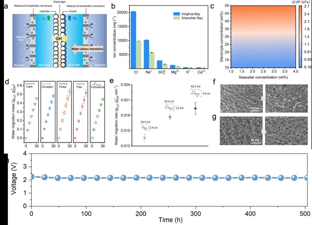 该团队基于2022年11月在《自然》发表的“海水直接电解制氢全新原理”,构建出真实大海不可控海洋波动环境下海水直接制氢全新路径与技术,并系统研究不同海水组分(广东省深圳湾、福建省兴化湾)浓度变化所导致界面蒸气压差差异,阐明浓度动态变化下相变迁移过程的自调控自适应机制。