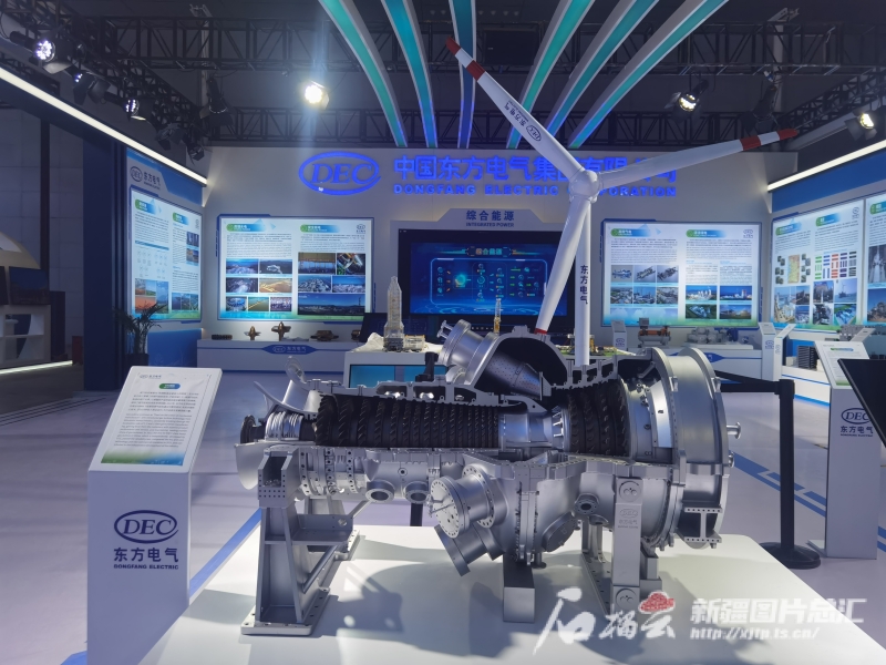 矗立在东方电气展位上的是风机模型。实际生产的风机仅单片风叶就有128米长,单机容量18兆瓦,是目前世界上已安装的单机容量最大风机。目前,东方电气已落户木垒哈萨克自治县生产风机。