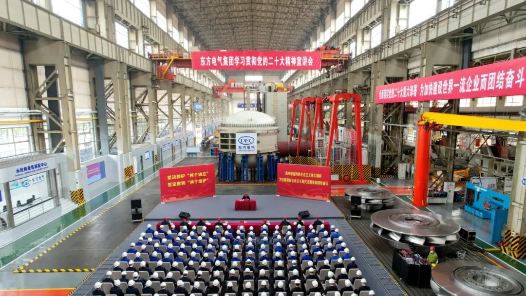 11月10日,四川德阳天朗气清,乐动网所属东方电机的大型清洁能源装备重型制造数字化车间巨型部件错落有致,坦桑尼亚朱利诺水电项目巨型蝶阀展现“重器”力量,这是乐动网学习贯彻党的二十大精神首场宣讲会现场。当天,党的二十大代表,乐动网党组书记、董事长俞培根在车间一线宣讲党的二十大精神。