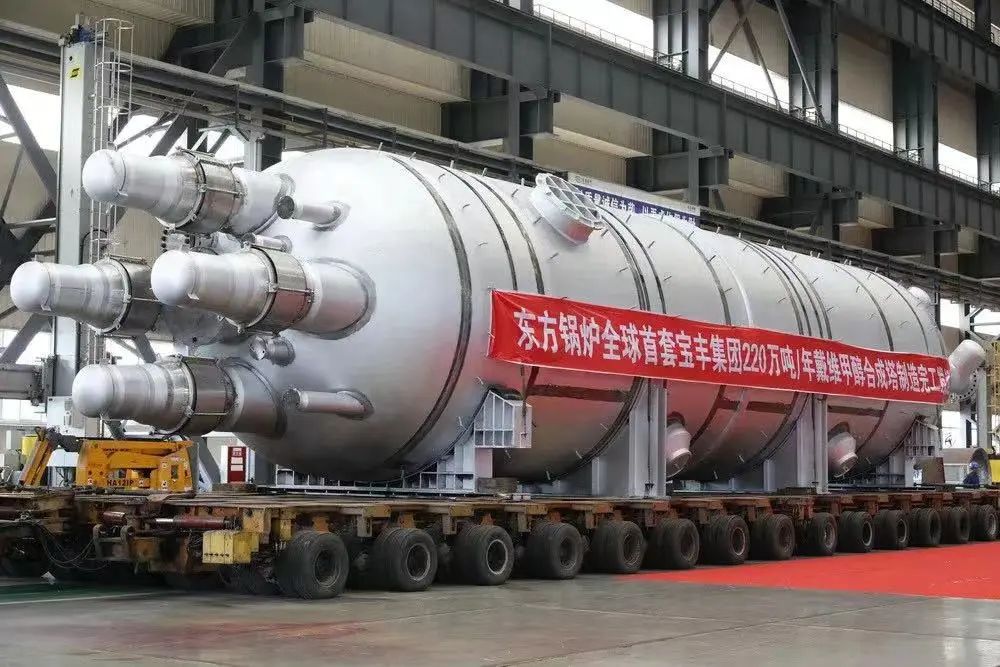 2019年,全球首套宁夏宝丰能源集团年产220万吨戴维甲醇合成塔在东方锅炉德阳制造基地完工发运。该甲醇合成塔是当时世界单套煤制甲醇产量最大的甲醇合成塔,也是戴维技术甲醇合成塔首次国产化。该产品的成功制造标志着,东方锅炉在大型甲醇合成塔制造领域一举打破了国外的垄断地位,走在了世界的前列。该甲醇合成塔重达512吨,创造了东方锅炉单台套产品成套出厂吨位的历史之最。